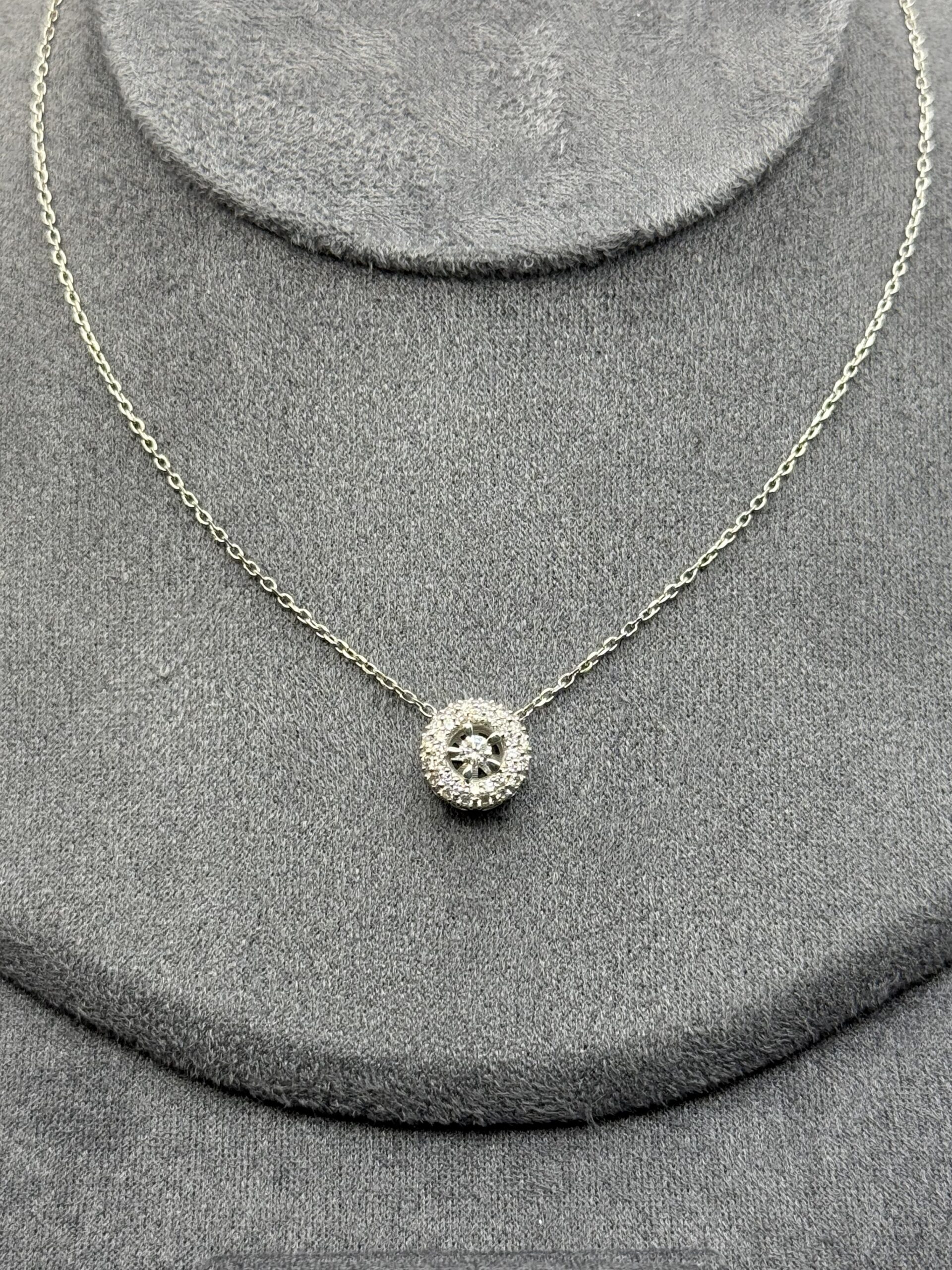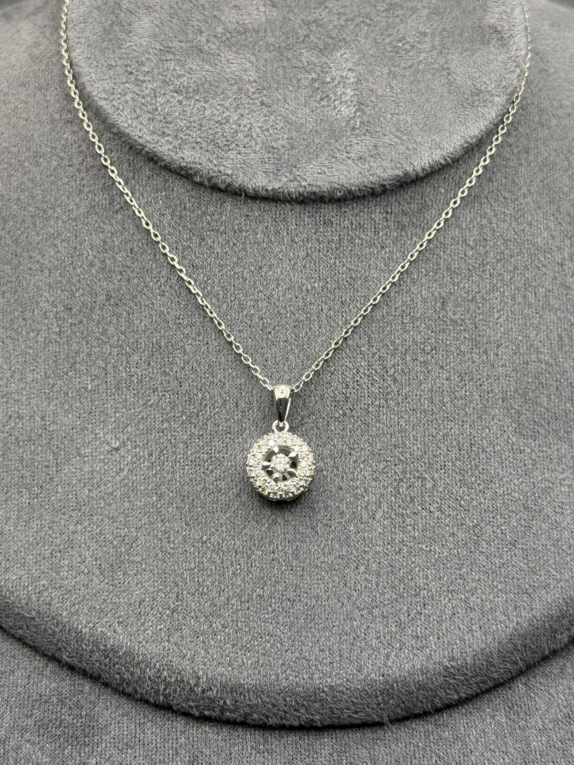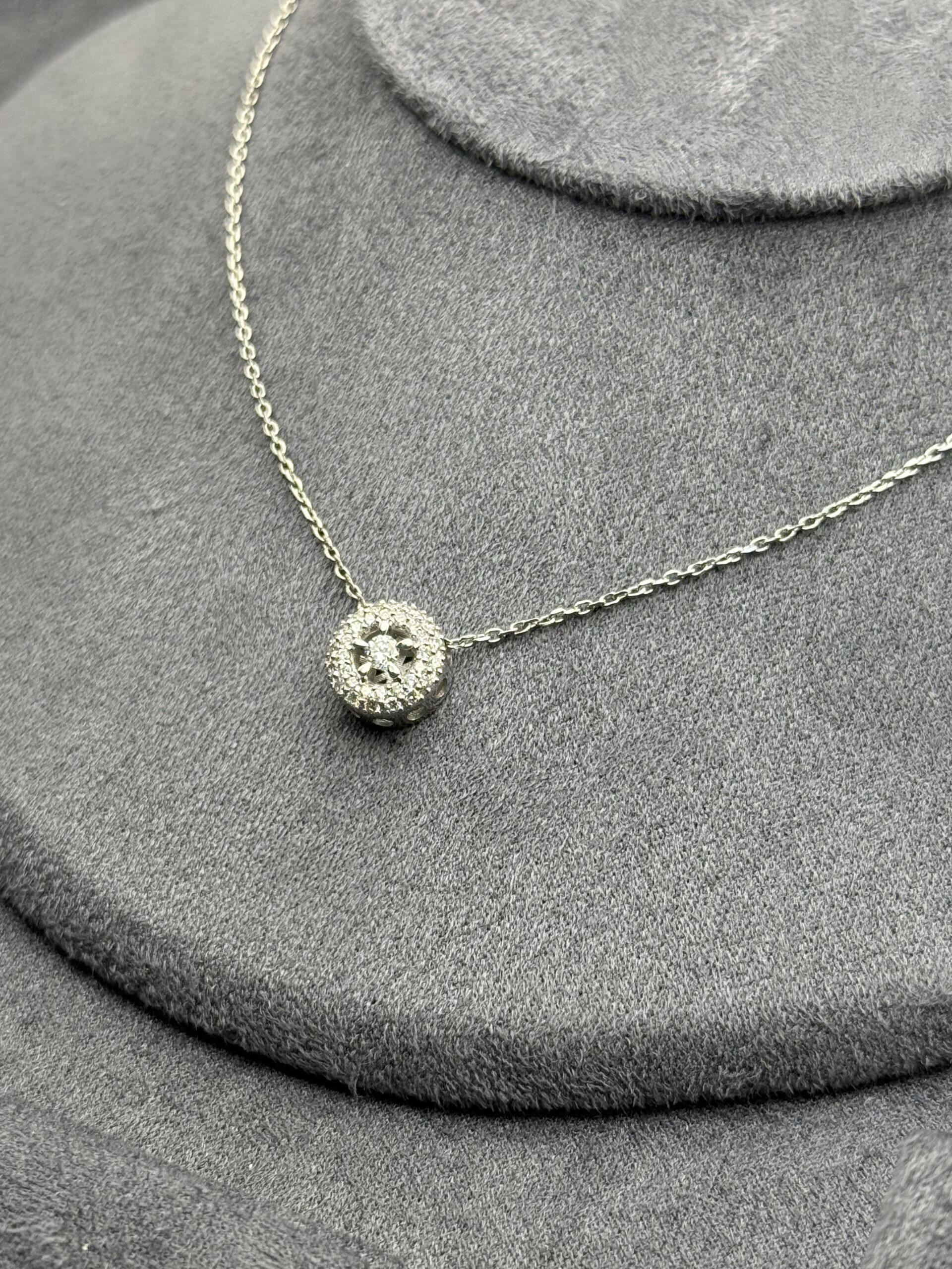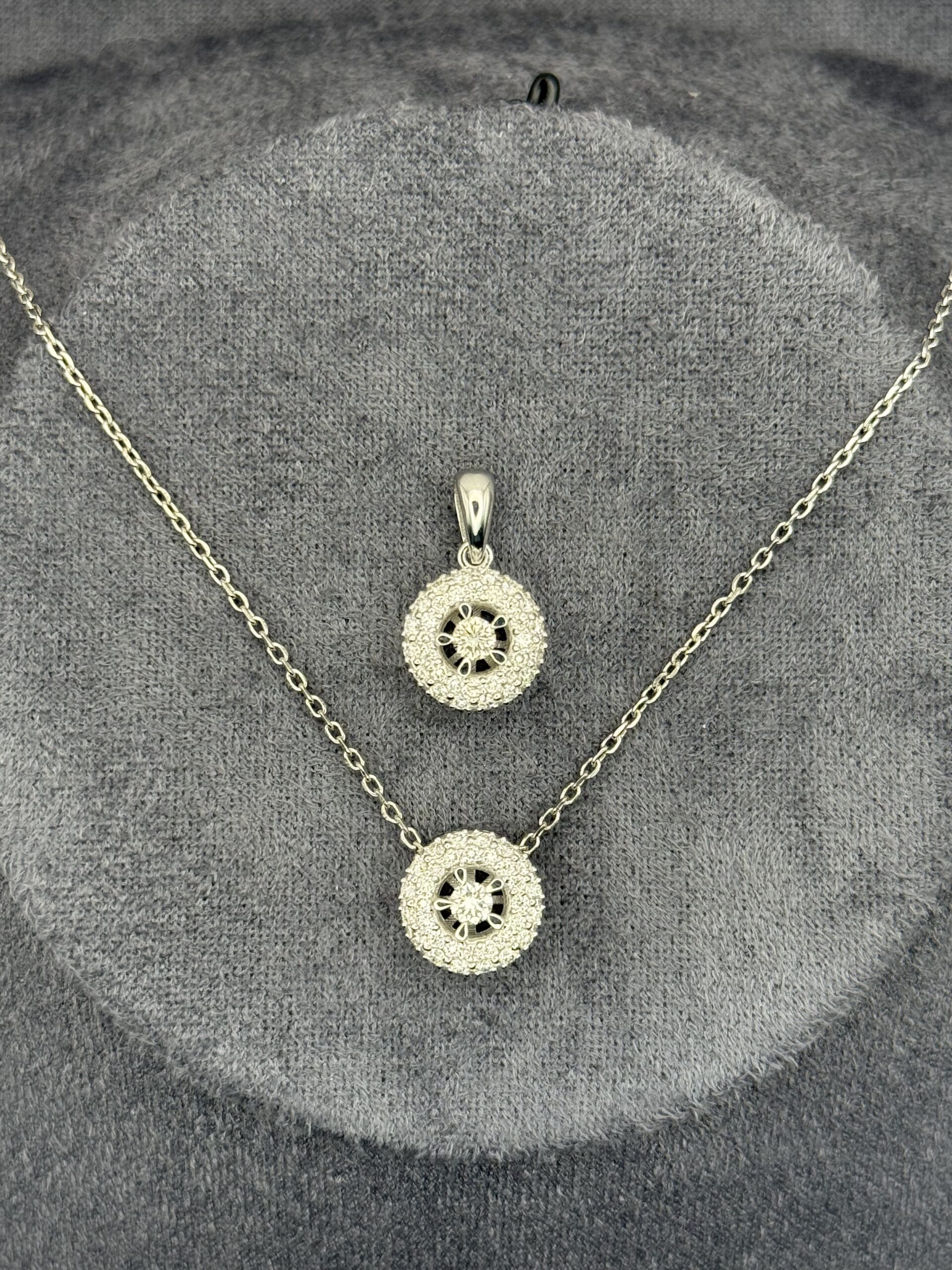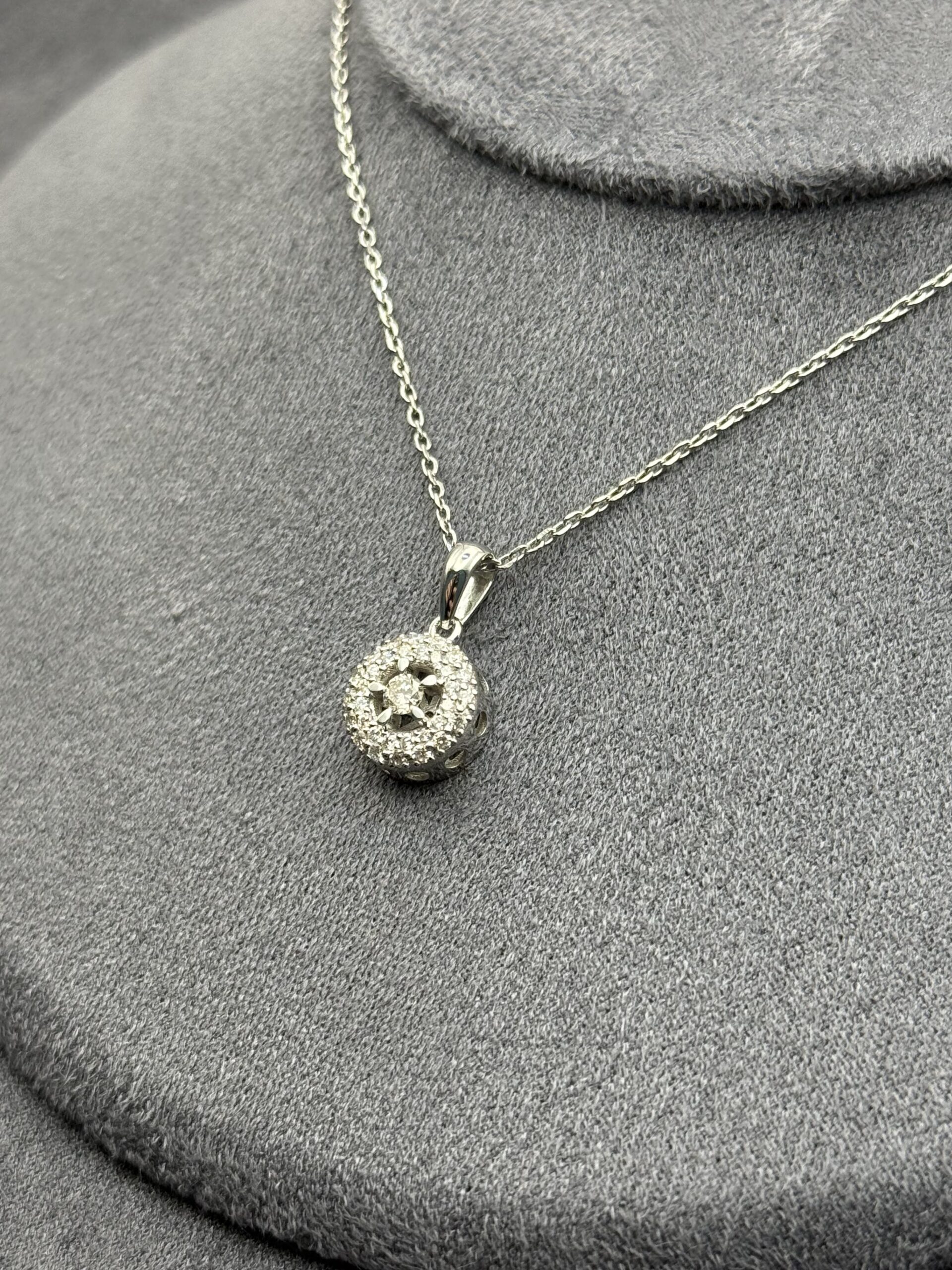 Զգացեք այս ադամանդապատ կախազարդի սառը շքեղությունը: Կենտրոնական աստղը շրջապատված է մանր քարերի փայլուն հալոյով, որը ստեղծում է ուժեղ տեսողական էֆեկտ։ Կատարյալ է որպես հարսանեկան նվեր կամ հատուկ առիթների համար։